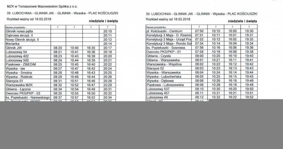 Od niedzieli 18 marca br. zmiana w rozkładzie obowiązującym w niedziele i święta dla linii Nr 35.