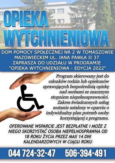 Dom Pomocy Społecznej w Tomaszowie Mazowieckim zaprasza do udziału w Programie "Opieka Wytchnieniowa - edycja 2022".