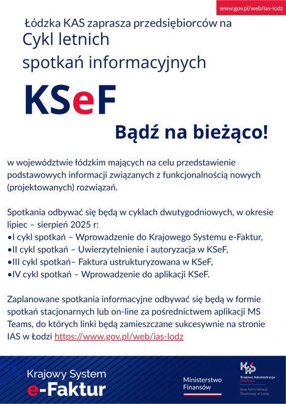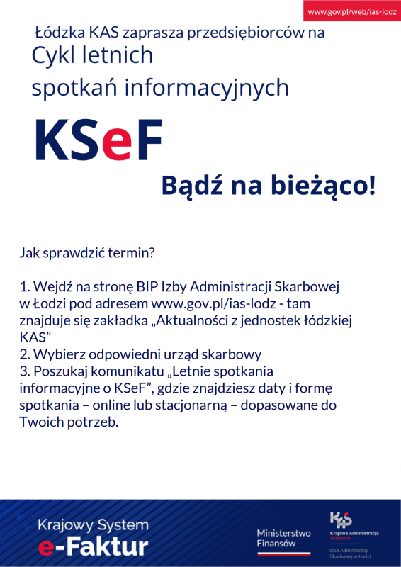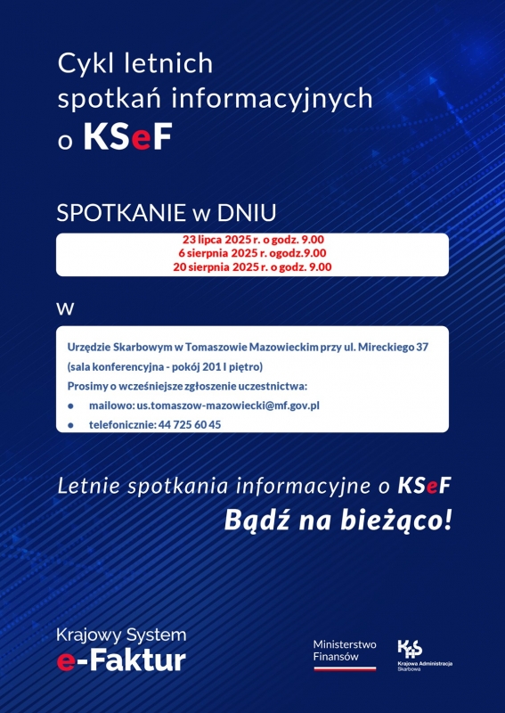 Naczelnik Urzędu Skarbowego w Tomaszowie Mazowieckim  zaprasza na „Letnie spotkania informacyjne o KSeF. Bądź na bieżąco” poświęcone Krajowemu Systemowi e-Faktur (KSeF).