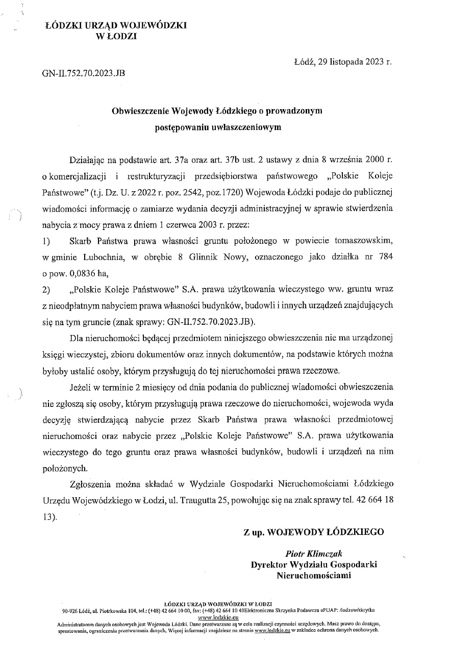 Wojewoda Łódzki podaje do publicznej wiadomości informację o zamiarze wydania decyzji administracyjnej w sprawie stwierdzenia nabycia z mocy prawa przez Skarb Państwa prawa własności gruntu dz. nr ewid. 784 położonej w obrębie 0008-Glinnik Nowy oraz prawa użytkowania wieczystego do tego gruntu przez "Polskie Koleje Państwowe" S.A.