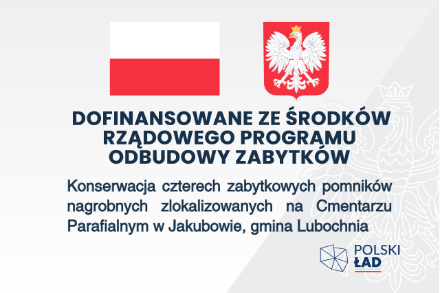 W dniu 13 listopada 2024 r. Parafia Rzymskokatolicka pw. Wniebowzięcia Najświętszej Maryi Panny w Lubochni, reprezentowana przez ks. Tomasza Bojanowskiego – Proboszcza Parafii, podpisała z firmą NIMBUS CONSORTIS Sp. z o.o., reprezentowaną przez Pana Piotra Obłoga, umowę na realizację zadania pn. Konserwacja czterech zabytkowych pomników nagrobnych zlokalizowanych na Cmentarzu Parafialnym w Jakubowie, gmina Lubochnia, finansowanego w ramach udzielonej przez Gminę Lubochnia dotacji w kwocie 155.595,00 zł, w tym kwota 3.111,90 zł stanowiąca środki z budżetu Gminy Lubochnia oraz kwota 152.483,10 zł stanowiąca środki pozyskane przez Gminę w ramach dofinansowania z Rządowego Programu Odbudowy Zabytków. W ramach zadania, którego realizację zaplanowano dwuetapowo: etap I – opracowanie Programu Prac Konserwatorskich oraz uzyskanie pozwolenia Wojewódzkiego Urzędu Ochrony Zabytków na prowadzeni prac; etap II – wykonanie prac konserwatorskich oraz opracowanie końcowej dokumentacji, wykonana zostanie konserwacja czterech zabytkowych pomników nagrobnych zlokalizowanych na Cmentarzu Parafialnym w Jakubowie, tj.: