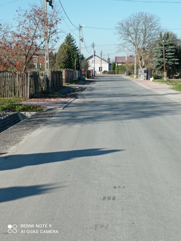 - obustronne pobocza: prawostronne z destruktu o szerokości 0,75 m; lewostronne utwardzone z kostki brukowej betonowej o grubości 8 cm i szerokości od 0,90 m do 1,20 m,