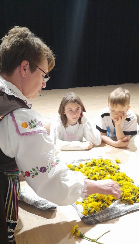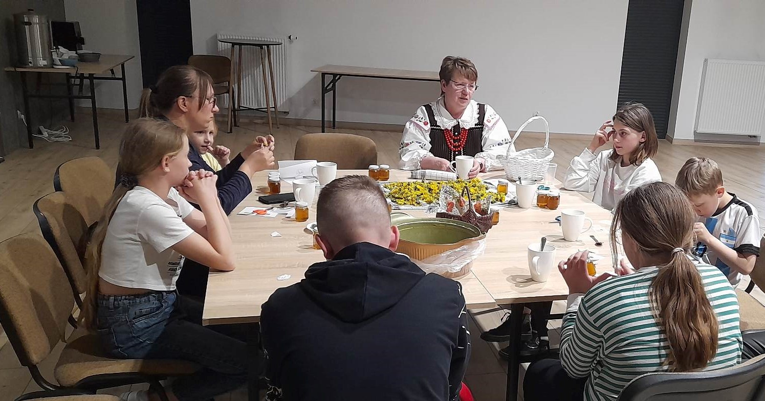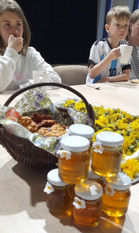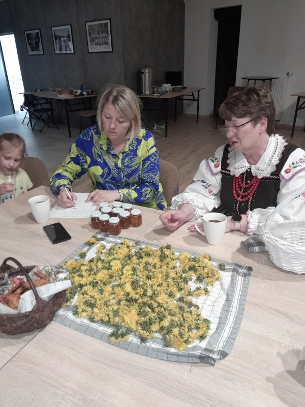 Podczas warsztatów uczestnicy zapoznali się z procesem wytwarzania syropu z mniszka lekarskiego, dowiedzieli się o jego wielu właściwościach zdrowotnych oraz walorach smakowych. Gospodynie z KGW „Stokrotki” od lat specjalizują się w wyrobie syropu z mniszka częstując nim przyjezdnych do gminy gości, podczas festynów, jarmarków. Na warsztatach mogliśmy również spróbować pysznych ciasteczek wypieczonych z dodatkiem mniszka a także lemoniady.