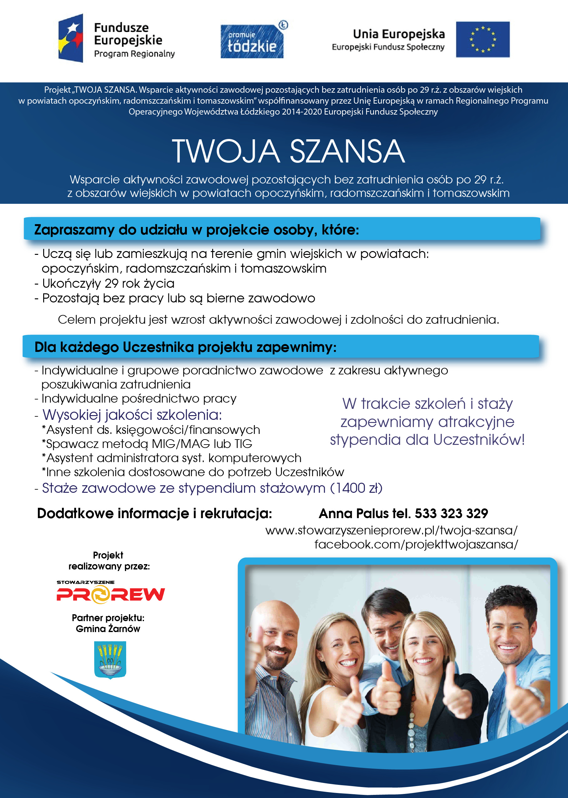 Projekt „TWOJA SZANSA. Wsparcie aktywności zawodowej pozostających bez zatrudnienia osób po 29 r.ż. z obszarów wiejskich w powiatach opoczyńskim, radomszczańskim i tomaszowskim” współfinansowany przez Unię Europejską  w ramach Regionalnego Programu Operacyjnego Województwa Łódzkiego 2014-2020 Europejski Fundusz Społeczny.