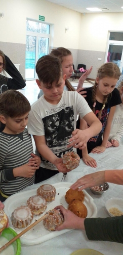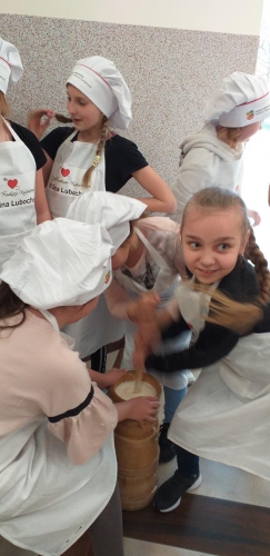 Dzieci w wieku od 6 do 12 lat, uśmiechnięte, zadowolone i pełne zapału do pracy, rozpoczęły swoją małą przygodę kulinarną. Podczas warsztatów samodzielnie ubijały masło i formowały z niej osełkę. Ponadto piekły babki wielkanocne i zajadały się pysznym wiejskim chlebem, z wcześniej już ubitym masłem. Dzieci zgodnie stwierdziły, że samodzielnie przygotowany posiłek smakuje najlepiej, a słodkie wypieki w postaci bab wielkanocnych uczestnicy warsztatów mogli zabrać ze sobą do domu.