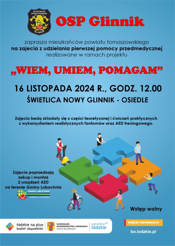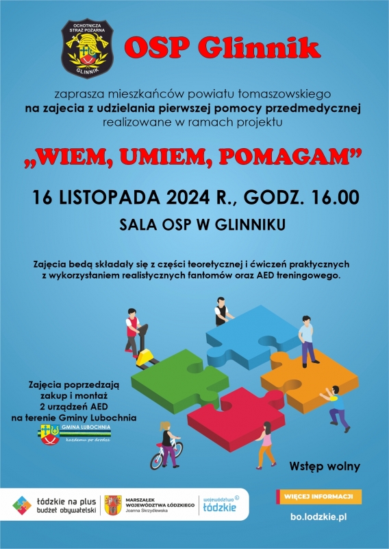 OSP Glinnik realizuje zadanie "Wiem, umiem, pomagam" , ktore zostało zgłoszone do Budżetu Obywatelskiego Województwa Łódzkiego przez naszą mieszkankę. Projekt ma na celu podniesienie bezpieczeństwa mieszkańców powiatu tomaszowskiego ze szczególnym uwzględnieniem mieszkańców Gminy Lubochnia poprzez przeprowadzenie zajęć z zakresu pierwszej pomocy przedmedycznej dla min. 200 osób oraz zakup 2 defibrylatorów AED wraz z kapsułami do ich przechowywania.