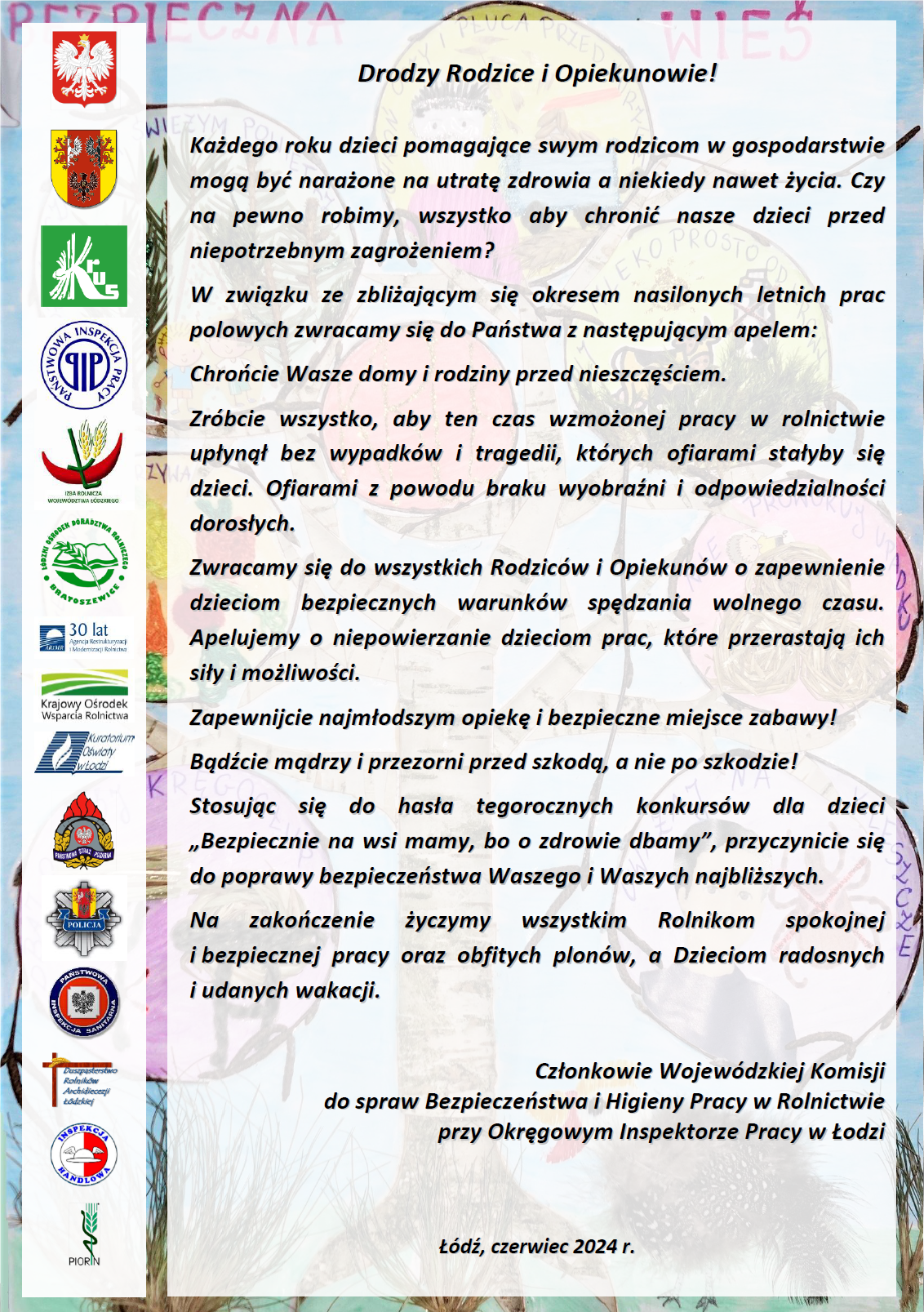 W załączeniu przekazuję również apel Wojewódzkiej Komisji ds. bhp w rolnictwie przy Okręgowym Inspektorze Pracy w Łodzi, dotyczący zapewniania bezpiecznych wakacji najmłodszym mieszkańcom wsi.
