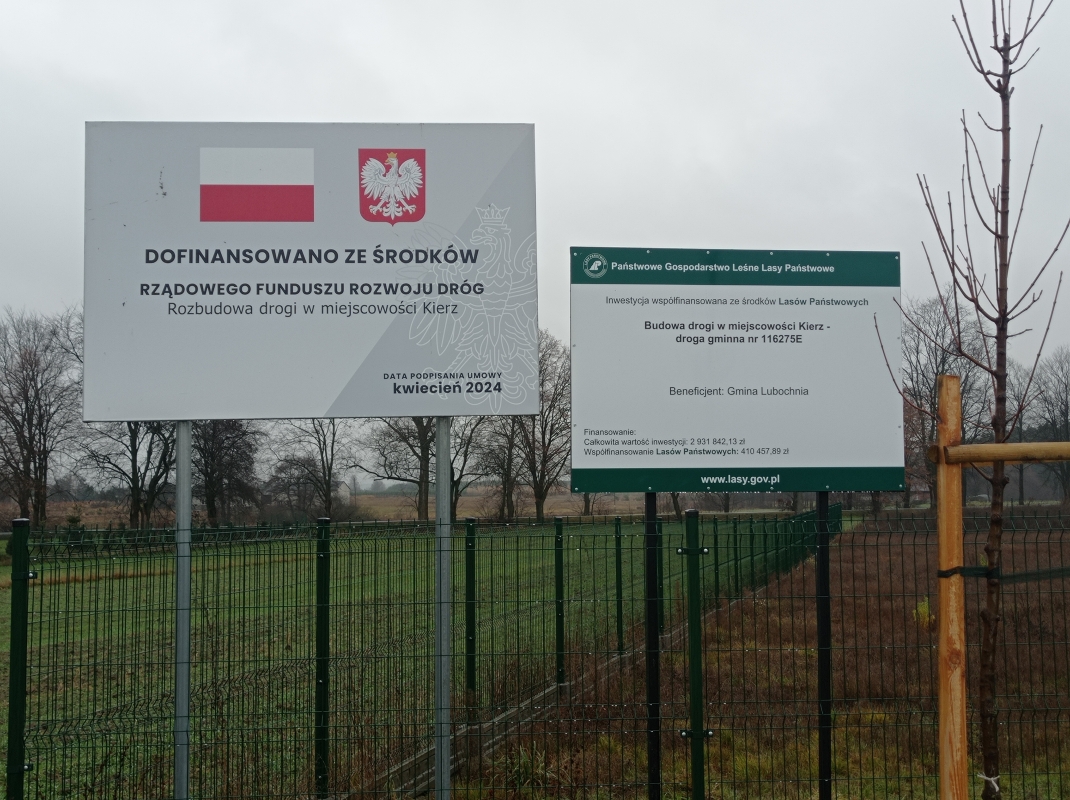 W dniu 2 grudnia 2024 r. podpisany został protokół odbioru końcowego zrealizowanych robót w ramach zadania pn. Budowa drogi w miejscowości Kierz - droga gminna nr 116275E, współfinansowanego ze środków funduszu leśnego, w ramach wspomagania przez Lasy Państwowe administracji państwowej w realizacji wspólnych przedsięwzięć oraz ze środków Rządowego Funduszu Rozwoju Dróg. Całkowita wartość robót wyniosła 3.409.506,91 zł brutto, w tym: