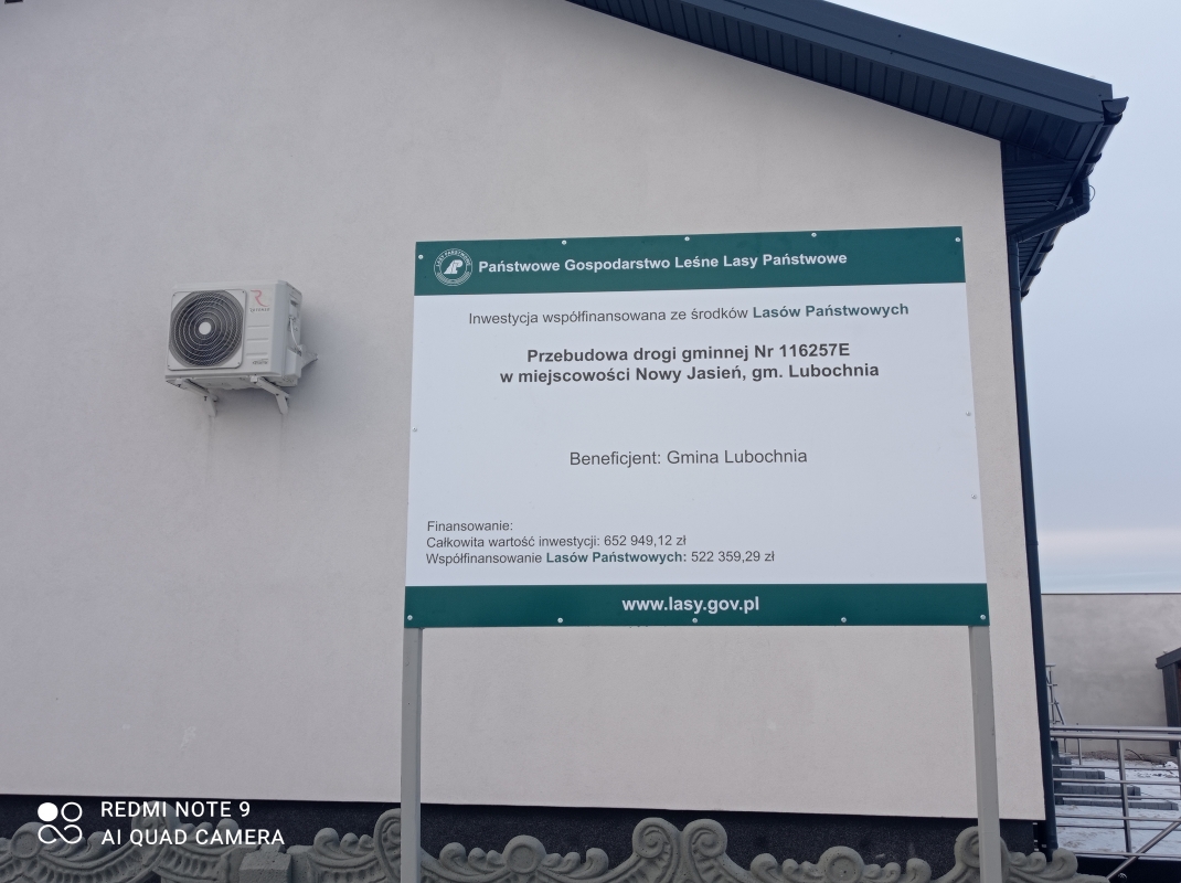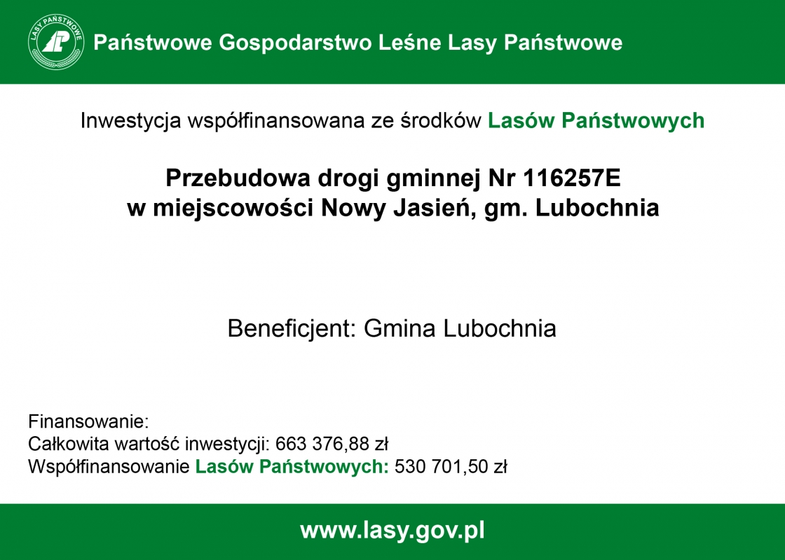 W dniu 17 listopada 2023 r. podpisany został protokół odbioru końcowego zrealizowanych robót w ramach zadania pn. Przebudowa drogi gminnej Nr 116257E w miejscowości Nowy Jasień, gm. Lubochnia, współfinansowanego ze środków funduszu leśnego, w ramach wspomagania przez Lasy Państwowe administracji państwowej w realizacji wspólnych przedsięwzięć. Całkowita wartość robót budowlanych wyniosła 652.949,12 zł brutto, w tym środki Lasów Państwowych w kwocie 522.359,29 zł. Wykonawcą była firma P.P.H.U. Sebastian Śliwiński z miejscowości Małecz, gmina Lubochnia.