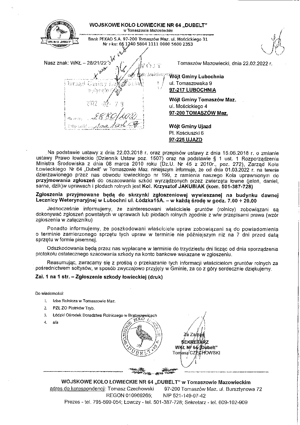 Zgłoszenia o szkodach wyrządzonych przez zwierzęta Do pobrania Druk zgłoszenia - Dubelt 0.04mb Koło Łowieckie Dubelt - pismo informacyjne ws. zgłaszania szkód w uprawach rolnych 0.16mb powrót